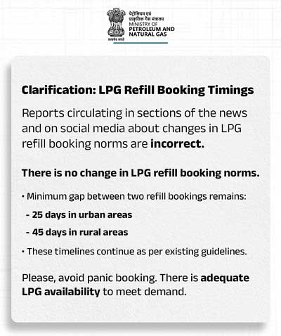 వంట గ్యాస్ రీఫిల్ బుకింగ్ గడువు పట్టణల్లో 25,గ్రామీణ ప్రాంతాల్లో 45 రోజులు-కేంద్రం