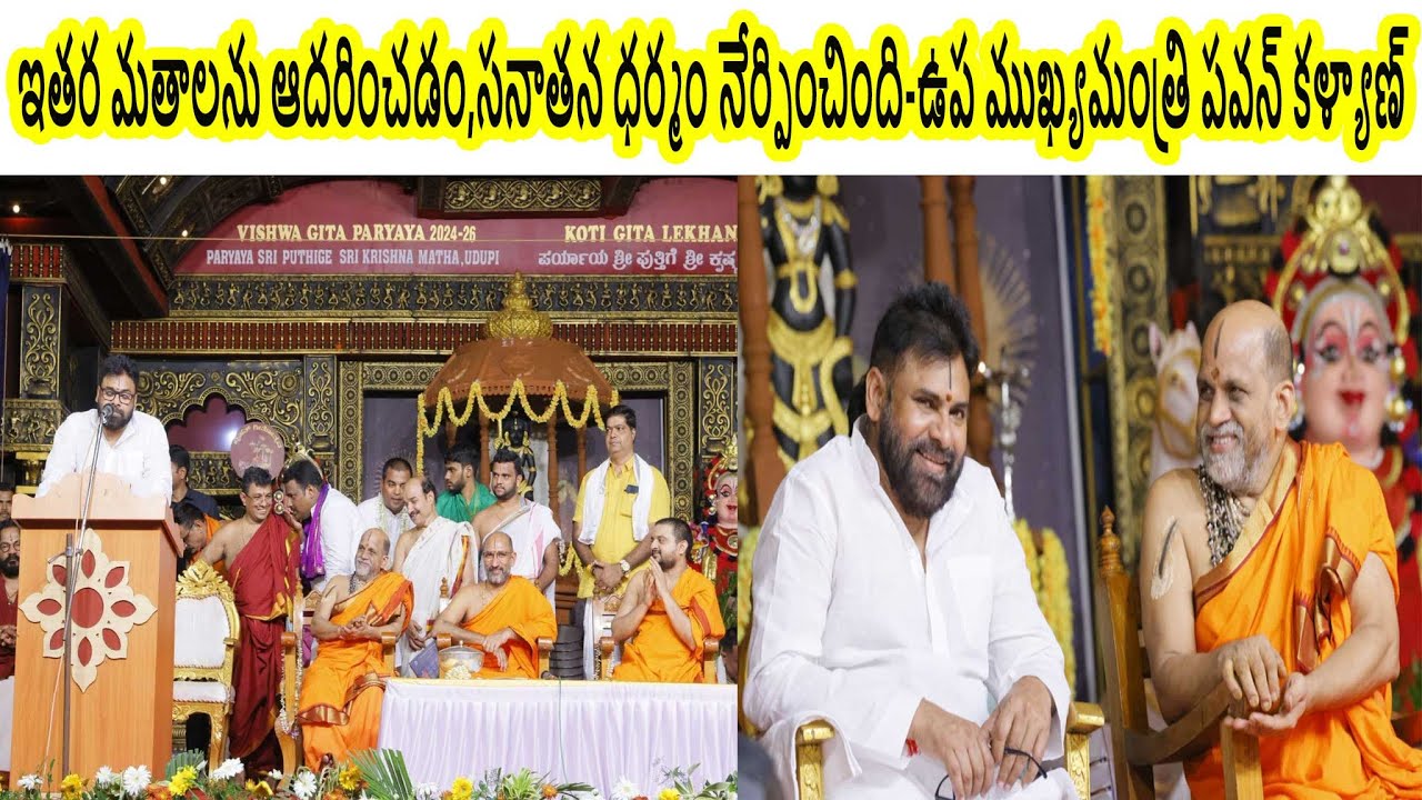 అమరావతి: రాష్ట్ర ఉప ముఖ్యమంత్రి పవన్ కళ్యాణ్ కి ‘అభినవ కృష్ణ దేవరాయ’ అనే బిరుదుని పర్యాయ పుట్టిగే శ్రీకృష్ణ మఠం మఠాధిపతి శ్రీ సుగుణేంద్ర తీర్థ స్వామీజీ రాష్ట్ర ప్రదానం చేశారు. పవన్ కళ్యాణ్ ఆదివారం, కర్ణాటకలోని పవిత్ర పుణ్యక్షేత్రం ఉడుపిలో పర్యటించారు.ఉడుపి శ్రీకృష్ణ దేవాలయం దర్శించుకున్నారు.పర్యాయ పుట్టిగే శ్రీకృష్ణ మఠం మఠాధిపతి శ్రీ సుగుణేంద్ర తీర్థ స్వామీజీ ఆహ్వానం మేరకు ‘బృహత్ గీతోత్సవ’లో పాల్గొని ప్రసంగించారు. భగవద్గీతలోని అంశాలను ప్రత్యేకంగా స్మరించుకునేందుకు, నేటి తరానికి భగవద్గీత గొప్పతనాన్ని వివరించేందుకు ఉడుపిలో ప్రత్యేకంగా ఈ కార్యక్రమం నిర్వహిస్తున్నారు.ఇటీవల గౌరవ ప్రధాని మోదీ ఉడుపిలో పర్యటించి బృహత్ గీతోత్సవలో పాల్గొన్నారు. లక్షలాది మంది పాల్గొనే ఆదివారం నాటి కార్యక్రమానికి ఉప ముఖ్యమంత్రి పవన్ కళ్యాణ్ ముఖ్యఅతిథిగా పాల్గొని, ప్రసంగించారు.