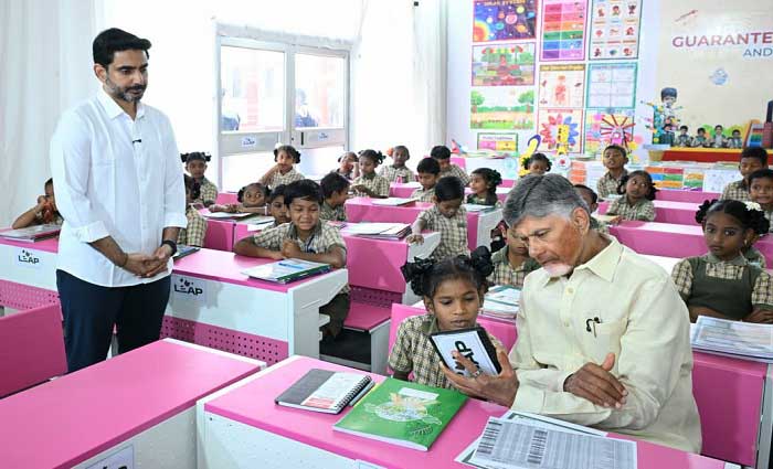 వివిధ క్రీడల్లో పాల్గొంటున్న క్రీడాకారులను ఉత్సాహపరిచారు.పేరెంట్ టీచర్ మీటింగ్ లో పాల్గొన్న సీఎం చంద్రబాబు, పేరెంట్స్ ఏం చదువుకున్నారని అడిగి తెలుసుకున్నారు. పిల్లలను బాగా చదివించండి… వాళ్లకు మీరు అందించే ఆస్తి చదువేనని అని అన్నారు. మధ్యాహ్న భోజనం రుచికరంగా ఉందా..? లేదా? అని అడిగి తెలుసుకున్నారు. ఇంటిగ్రేటెడ్ ల్యాబ్ లో విద్యార్థినుల ప్రజెంటేషన్ ఇవ్వగా,, స్టెమ్ ల్యాబ్ పరిశీలించారు.ల్యాబ్ లో విద్యార్థినుల ప్రజెంటేషన్ ఇచ్చిన తీరును అభినందించారు. క్లాస్ రూంలో కూర్చొని క్లికర్ విధానాన్ని విద్యార్థులతో కలిసి పరిశీలించారు.