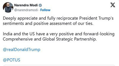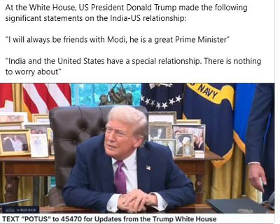 అమరావతి: ప్రపంచ దేశాలను బెదిరించి అమెరికా ముందు మెకారిల్లేలా చేసేందుకు అమెరికా 47వ అధ్యక్షడు అయిన డొనాల్డ్ ట్రంప్ పప్పులు భారతదేశ ప్రధాన మంత్రి నరేంద్ర మోదీ ముందు ఉడకలేదు..టారిఫ్ లతో భారతదేశంను లొంగ తీసుకొవాలని అన్ని రకాలుగా ప్రయత్నించిన ట్రంప్ కు,,ఇప్పుడిప్పుడే తత్వం భొధపడుతొంది..భారత్,,చైనా,,రష్యాలు దగ్గర అయితే అమెరికాతో పాటు యూరొప్ దేశాల ఆర్దిక వ్యవస్థలు కుప్పకూలిపోతాయి అనే విషయం “ఆర్దం అయ్యింది” అనిపిస్తొంది..ఈ నేపధ్యంలో శుక్రవారం మీడియా అడిగిన ప్రశ్నకు ట్రంప్ సమాధానం ఇస్తూ,భారత్‌-అమెరికా మధ్య ప్రత్యేక బంధం ఉందని,, ప్రధాని మోదీతో స్నేహంగా ఉంటానని వ్యాఖ్యనించారు..అంతేకాదు మోదీ గొప్ప ప్రధాని అంటూ కితాబిచ్చారు.. ట్రంప్‌ వ్యాఖ్యలపై ప్రధాని మోదీ తాజాగా స్పందించారు.. ట్రంప్‌ సానుకూల వైఖరి అభినందనీయమంటూ ట్వీట్టర్ లో వ్యాఖ్యనించారు..భారత్‌, అమెరికాలు మంచి భవిష్యత్తు, వ్యూహాత్మక భాగస్వామ్యాన్ని కలిగి ఉన్నాయని వెల్లడించారు.