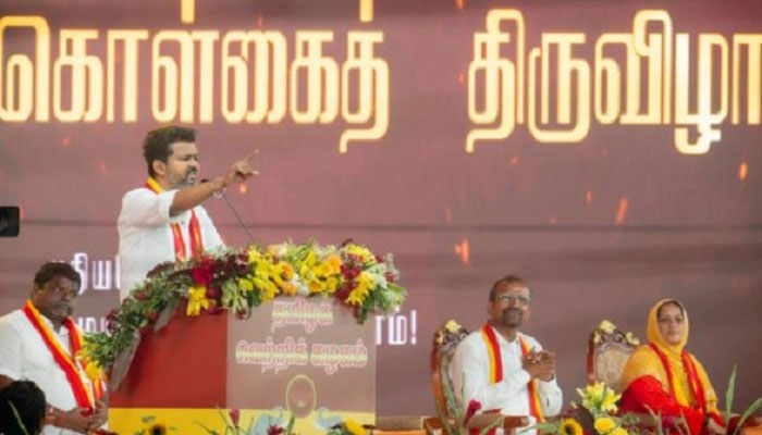 అమరావతిం మా ఏకైక భావజాల శత్రువు బీజేపీ,, మా రాజకీయ శత్రువు డీఎంకే అంటూ తమిళగ వెట్రి కళగం అధినేత సినిమా హిరో జోసెఫ్ విజయ్ చంద్రశేఖర్ స్పష్టం చేశారు..2026లో తమిళనాడులో జరగబోయే ఎన్నికల్లో ఇతర పార్టీలతో పొత్తుల గురించి కూడా క్లారిటీ ఇస్తూ TVK ఒంటరిగా నిలబడుతుందని, ఎవరికీ భయపడదని స్పష్టం చేశారు.. అడవిలో నక్కలు ఎన్ని ఉన్నా, సింహం ఒక్కటే రాజు అని,,దాని గర్జన చాలా దూరం వరకు వినిపిస్తుందన్నారు.. సింహం ఎప్పుడూ సింహమే అంటూ సమావేశంలో గర్జించారు.. గురువారం మదురైలో నిర్వహించిన రెండో రాష్ట్ర సమావేశంలో అయన మాట్లాడుతూ తమిళనాడు రాజకీయాల్లో తమ పార్టీ, డీఎంకే మధ్య పోటీ ఉంటుందని అభిప్రాయం వ్యక్తం చేశారు..అలాగే అలంగనల్లూర్ జల్లికట్టు, మీనాక్షి అమ్మన్ ఆలయం ఇవి అన్ని తమిళ ప్రజల ధైర్యం, సంప్రదాయాలకు చిహ్నాలని గుర్తు చేశారు.. తమిళ జాలర్ల సమస్యలు, కచ్చతీవు తిరిగి తీసుకోవాలనే డిమాండ్, నీట్ రద్దు చేయాలనే అంశాలను ప్రస్తావించారు.. మా పోరాటం మాదే, నేను ముందుండి నడిపిస్తానని స్పష్టం చేశారు.
