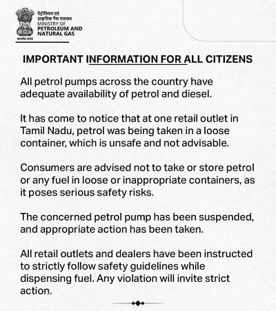 అమరావతి: దేశంలో పెట్రోల్, డీజిల్‌కు కొరత లేదని,,కంగారు పడి కొనుగోళ్లు చేయవద్దని ప్రజలను కోరుతూ ప్రకటన విడుదల చేసింది. సాధారణ కంటెయినర్‌ల్లో పెట్రోల్, డీజిల్ నిల్వ చేయడం ప్రమాదకరమని హెచ్చరిస్తూ తమిళనాడులో ఒక పెట్రోల్ బంక్ నుంచి సాధారణ కంటెయినర్‌లో పెట్రోల్ తీసుకుని వెళ్లుతున్న విషయం తమ దృష్టికి వచ్చిన నేపథ్యంలో ఈ సూచన చేస్తున్నట్టు తెలిపింది. ఇలాంటి చర్యలతో భద్రతాపరమైన ముప్పు పెరుగుతుందని హెచ్చరించింది. కంటెయినర్‌ల్లో పెట్రోల్‌ను పట్టి ఇస్తూన్న రిటైల్ ఔట్‌లెట్‌పై కఠిన చర్యలు తీసుకున్నామని పెట్రోలియం శాఖ వెల్లడించింది. పెట్రోల్, డీజిల్ విక్రయాలకు సంబంధించి పెట్రోల్ పంప్‌లు, డీలర్లకు భద్రతాపరమైన మార్గదర్శకాలు జారీ చేశామని కూడా కేంద్రం పేర్కొంది. నిబంధనలు ఉల్లంఘించిన వారిపై కఠిన చర్యలు తప్పవని హెచ్చరించింది. కంటెయినర్‌ల్లో పెట్రోల్, డీజిల్ ఎట్టి పరిస్థితిలోను నింప వద్దని రిటైల్ ఔట్‌లెట్‌కు సూచించింది.